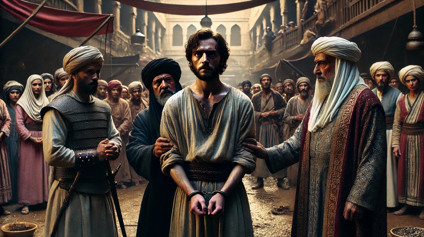 لكن القاضي لم يكن مستعجلًا، فقال بهدوء: إذا كنت بريئًا، فلماذا هذه القطعة من ثوبك موجودة في مكان السرقة؟ وكيف تفسّر صوت الرنين الذي سمعه حسّان وأكّد الجميع أنه يأتي من حزامك؟"