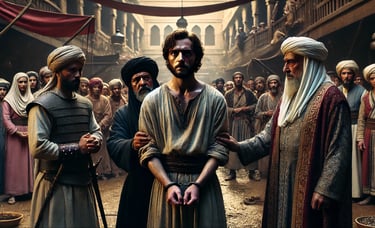 نظر القاضي عمرو إليه بتمعّن، ثم قال بصوتٍ هادئٍ لكنه نافذ: إن كنت بريئًا، فكيف تفسّر وجود هذه القماشة التي تطابق ملابسك في موقع الجريمة؟ وكيف وصفك حسّان دون أن يعلم أنك موضع شك؟"