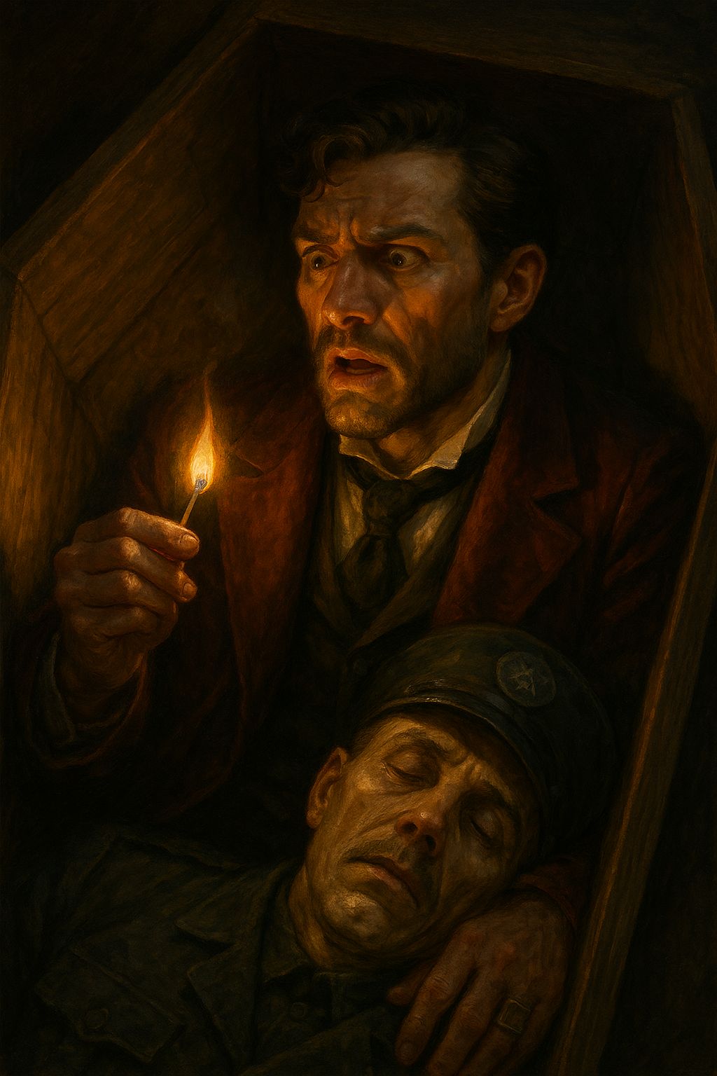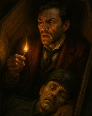 تحكي القصة عن رجلٍ ثريٍّ متهمٍ بجريمة قتل، أُلقي في سجنٍ على جزيرةٍ معزولة لا يخرج منها أحد إلا ميتًا. ولشدة خوفه من الإعدام، خطط مع أحد السجّانين للهرب داخل تابوت ميت، على أن يخرجه السجّان بعد دفنه بنصف ساعة. نفّذ الثري الخطة، وتمدّد داخل التابوت بجوار جثةٍ هامدة، ثم دُفن حيًّا، ينتظر لحظة النجاة. لكن الوقت طال، والهواء نفد، والذعر اشتدّ، فأشعل عود كبريت ليرى من بجانبه... فإذا به وجه السجّان نفسه!